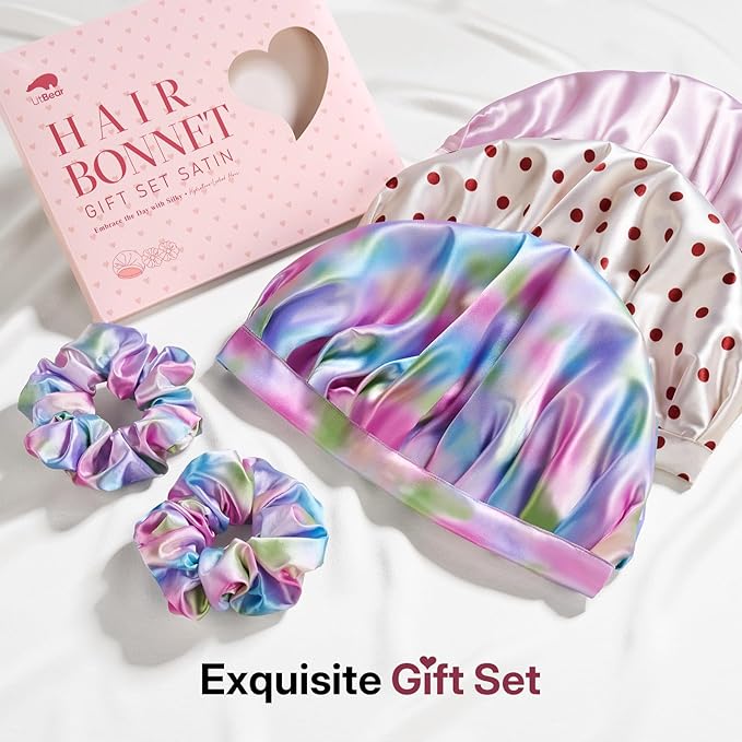 - Exquisite Gift Set: LitBear silk bonnet for sleeping set includes 1 bonnet, 2 scrunchies (5.5CM), beautifully presented in an exquisite gift box. It serves as both a stylish accessory for daily wear and a romantic Valentine’s Day gift—perfect for wife, girls, friends, and family.