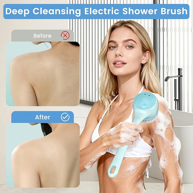 Electric Back Scrubber for Shower - Waterproof Rechargeable Exfoliating Brush for Deep Cleansing, Soft Bristles for Sensitive Skin, Dry/Wet Use for Back, Arms & Legs (Blue)