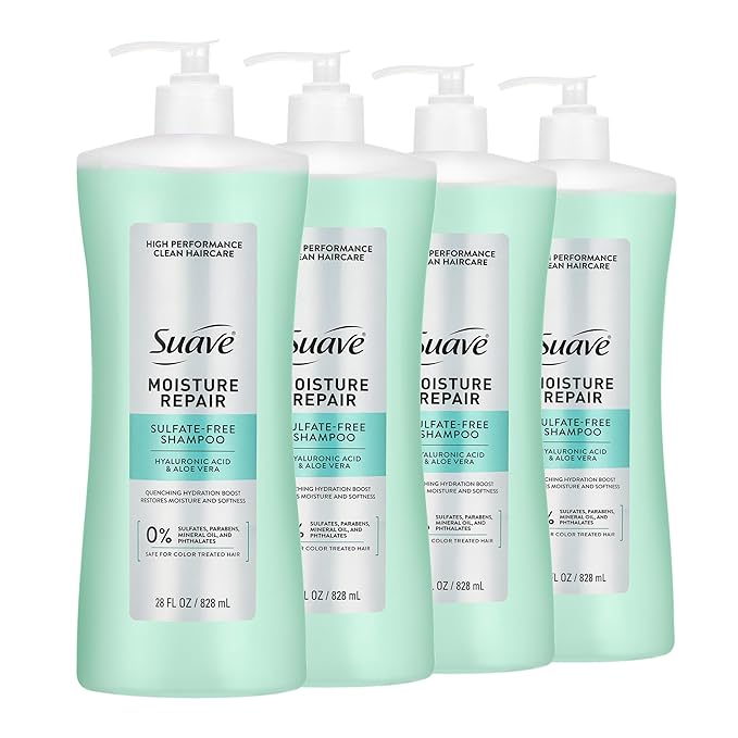Suave Moisture Repair Sulfate-Free Shampoo with Hyaluronic Acid & Aloe Vera, Hydrates & Restores Dry, Damaged Hair, 4 Count, 28 FL OZ