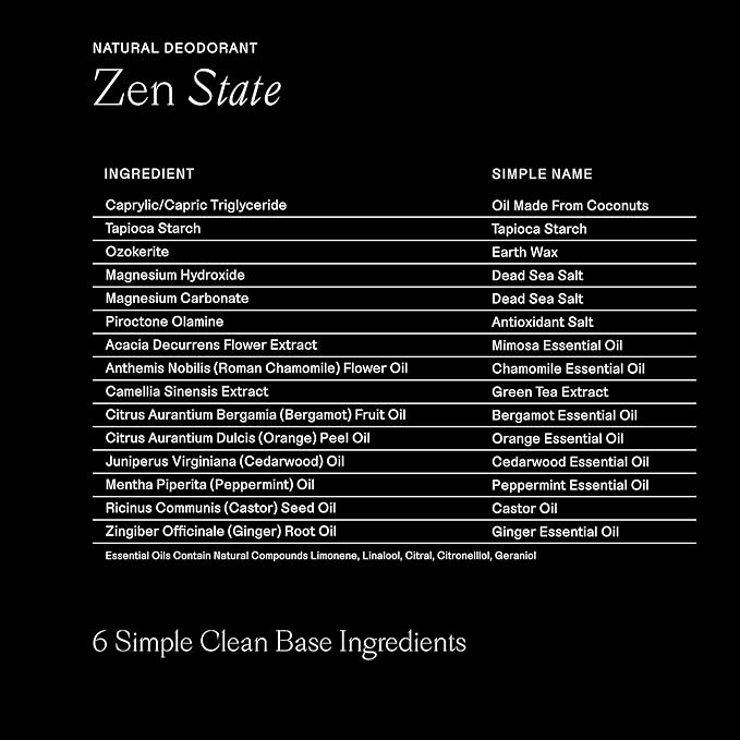 - Zen State: This sensitive skin deodorant smells like a day at the spa with hints of green tea, bergamot and soft woods unfold - grounding, refreshing, serene. A mindful blend of citrus and botanicals that refreshes body and spirt.
