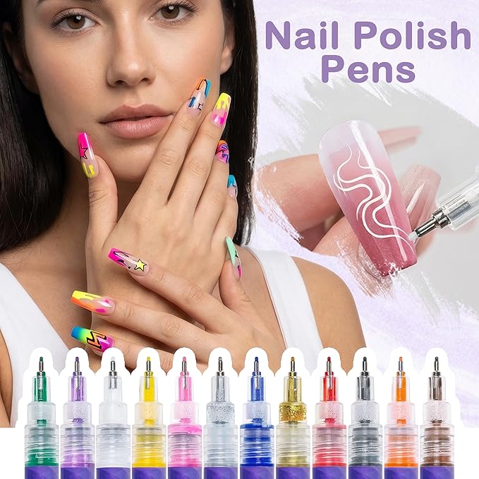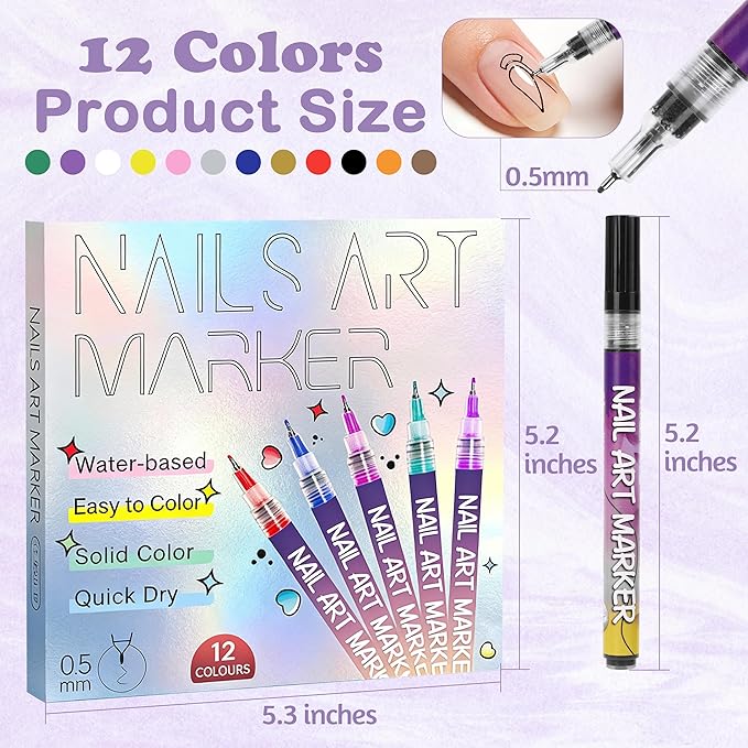 - 12 Color Nail Art Pens: Unleash your creative inspiration. These highly saturated, quick-drying, and smudge-proof shades deliver vibrant, eye-catching results on any base color, helping you create stunning nail designs