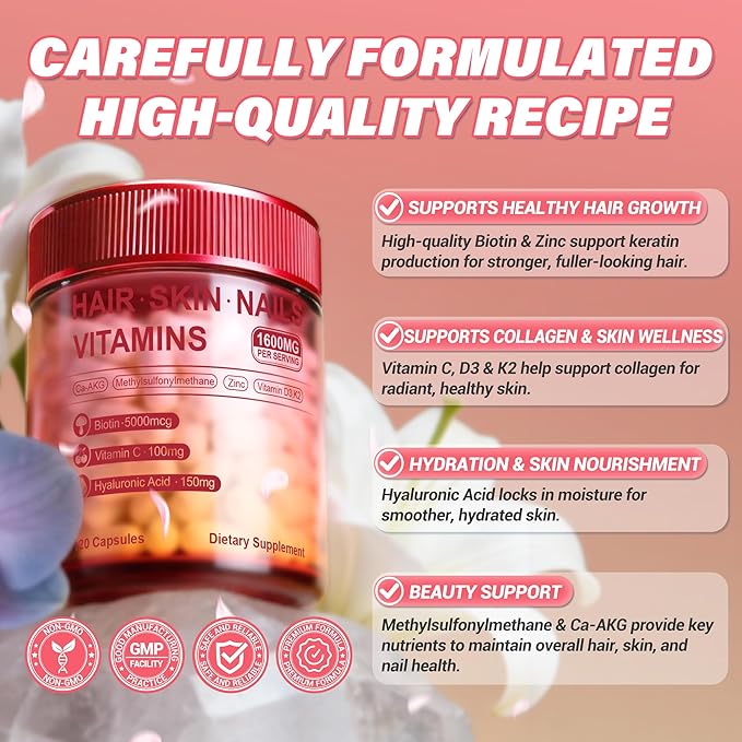 - Advanced Beauty Support: Our potent formula combines Biotin, MSM, and Hyaluronic Acid to nourish hair, skin, and nails from within, promoting fuller hair, resilient nails, and naturally radiant, healthy-looking skin.