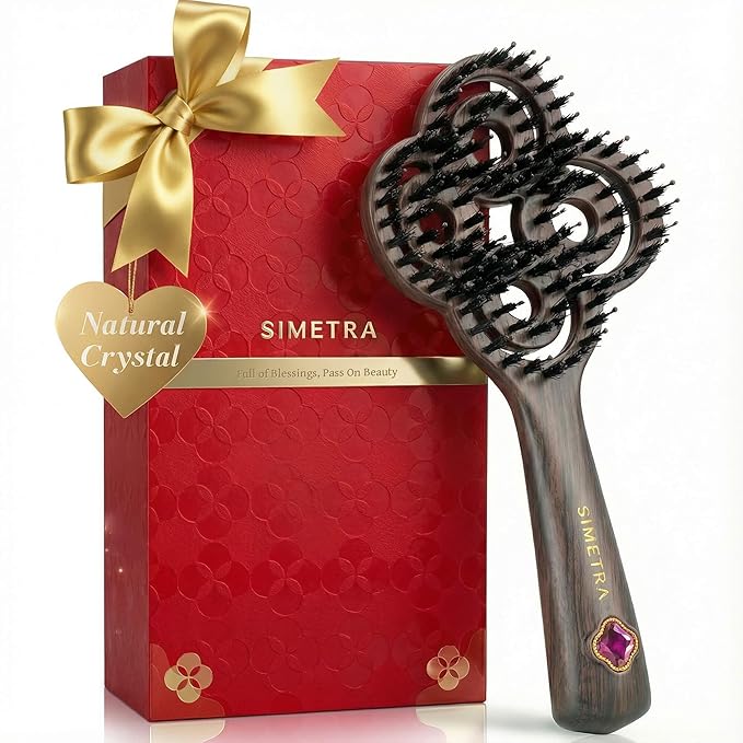 SIMETRA Lucky Hair Brush for Women & Men, 14K Gold Plated Wet Brush Detangling Brush for All Hair Types, Natural Crystal Inlay Boar Bristle Hair brush, Curly Detangler HairBrush for Scalp Massage Gift