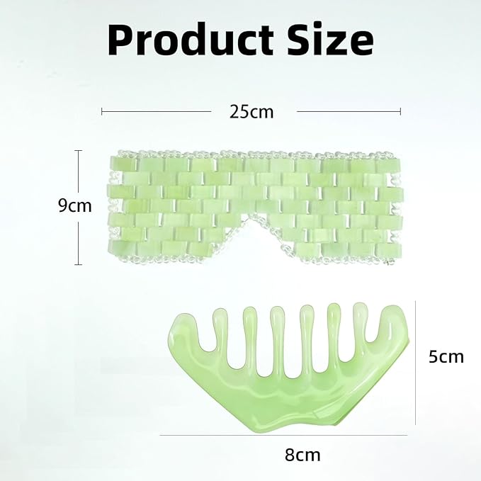- 【Size & Ergonomic Design】 The jade eye mask measures approximately 10.24 x 3.54 inches, offering full eye coverage. The gua sha comb is about 3.46 x 1.97 inches, a fit size designed to comfortably massage the scalp, face, and body with precision.