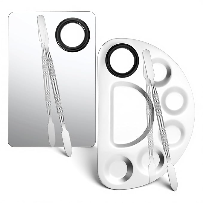 - Makeup Palette Tray Set: This makeup mixing palette set includes a stainless steel square palette, a fan palette and 2 blending spatula. The palettes size: a semicircle measuring 12.5x8.2 cm and a rectangle measuring 11.5x7.5 cm, designed to accommodate different mixing techniques and product amounts