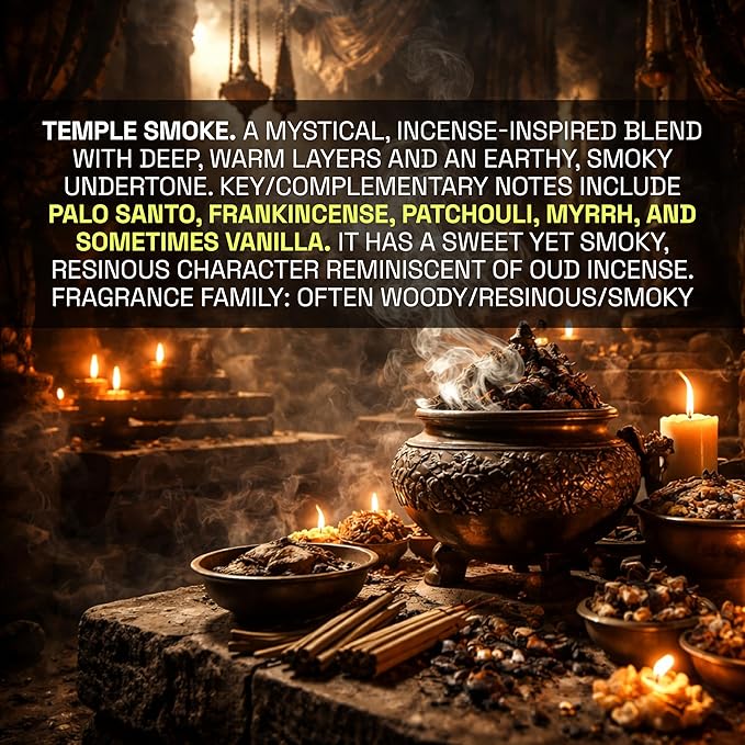 - Temple Smoke is a mystical blend inspired by the rich fragrance of oud incense. It has deep and warm layers with an earthy, smoky undertone. The complementary notes of palo santo, frankincense, and patchouli create a rich and long-lasting blend. This resinous and smoky fragrance is perfect for a temple retreat or hastily retreating from a temple.