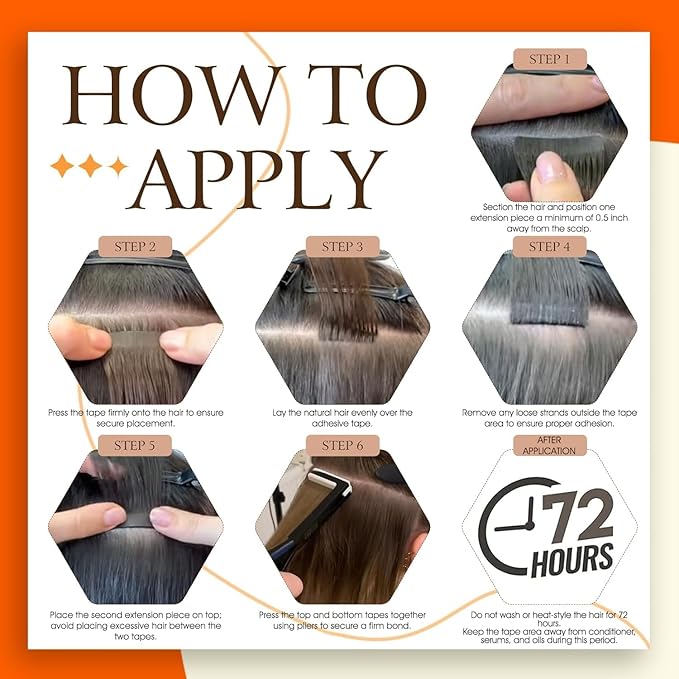 - Easy to Apply: Tape in hair extensions are designed for a streamlined application; When using the sandwich method, align both pieces, avoid excessive heat on the tape; Do not overload hair between sections; Pre-taped strips allow faster application